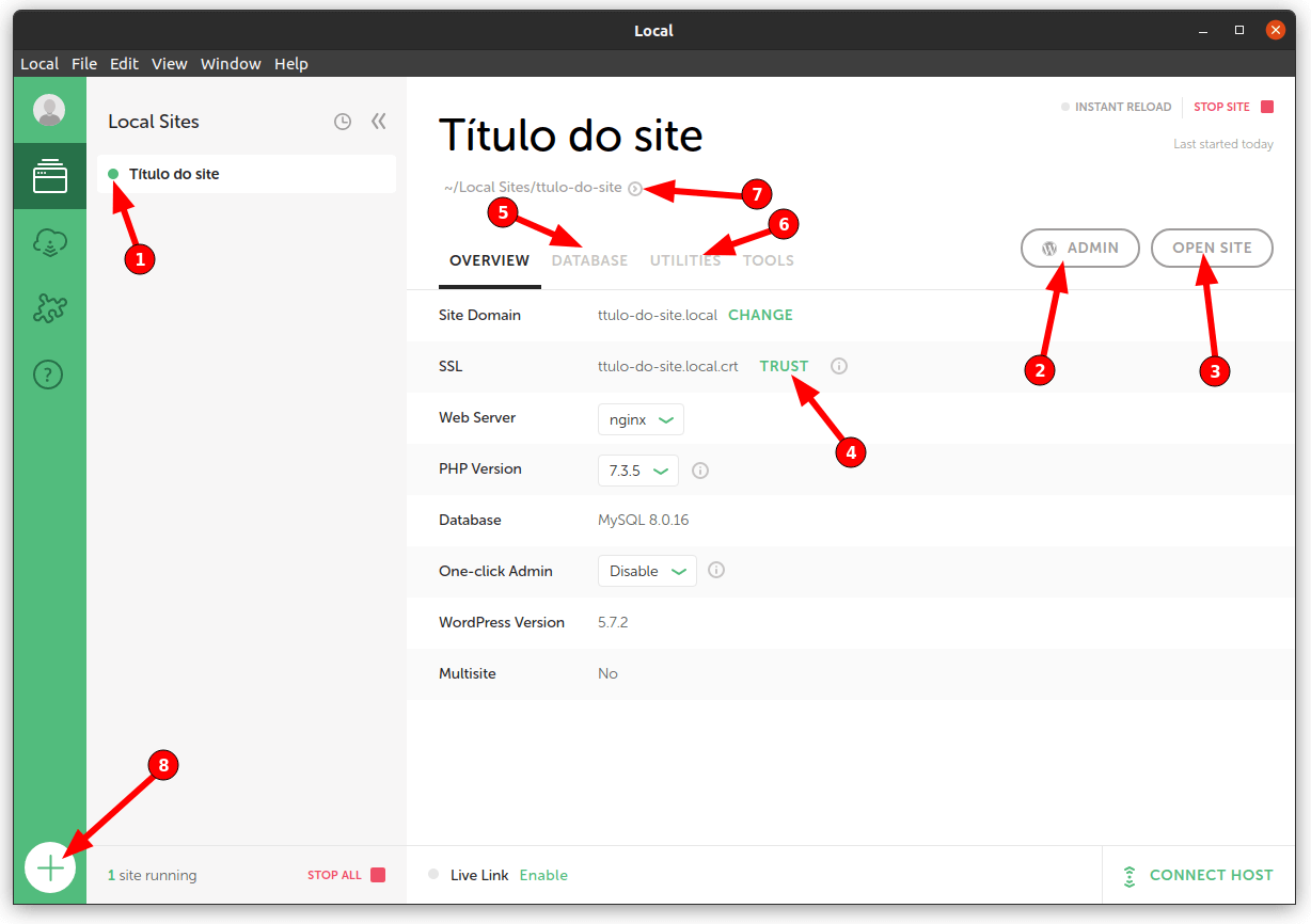 O Local possui uma funcionalidade bem legal que é a possibilidade de entrar automaticamente na tela administrativa como um usuário pré-definido. Para isso selecione o usuário desejado na opção One-click Admin (1) e depois clique no ADMIN (2). Esta opção também é bem útil caso você esqueça a senha do seu usuário.