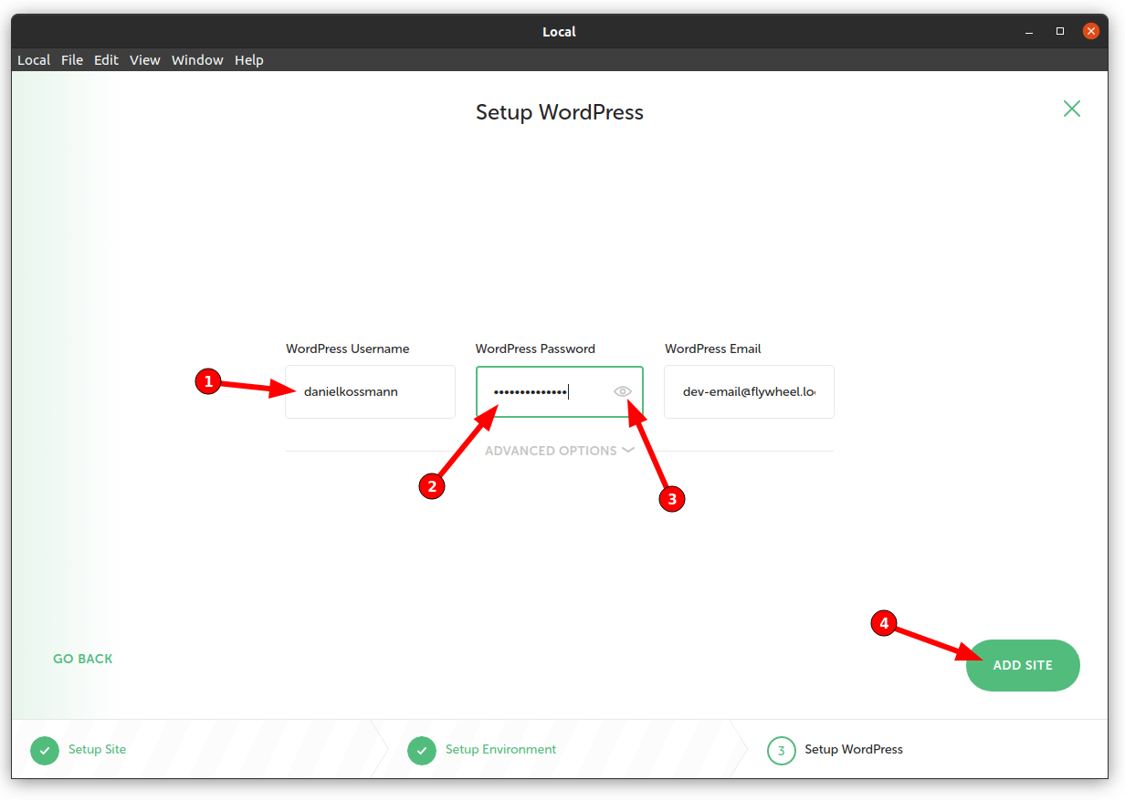 Por último, você deve definir o acesso ao painel administrativo do WordPress. Para o nome de usuário (1) a única regra é não usar admin. Sugiro escolher um outro nome fácil de lembrar (é mais chato alterar este nome depois, então evite usar algo temporário). Após preencher o campo de senha (2), sugiro clicar no ícone do olho (3) para verificar se você a digitou corretamente, pois como não há um campo para digitar a senha novamente, é muito fácil fazer erros na digitação. Depois clique em Add site (4).