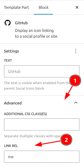 Another option would be to add my GitHub URL on the website, so I added it in my header using the social media block, but then realized that the code didn’t include rel="me"