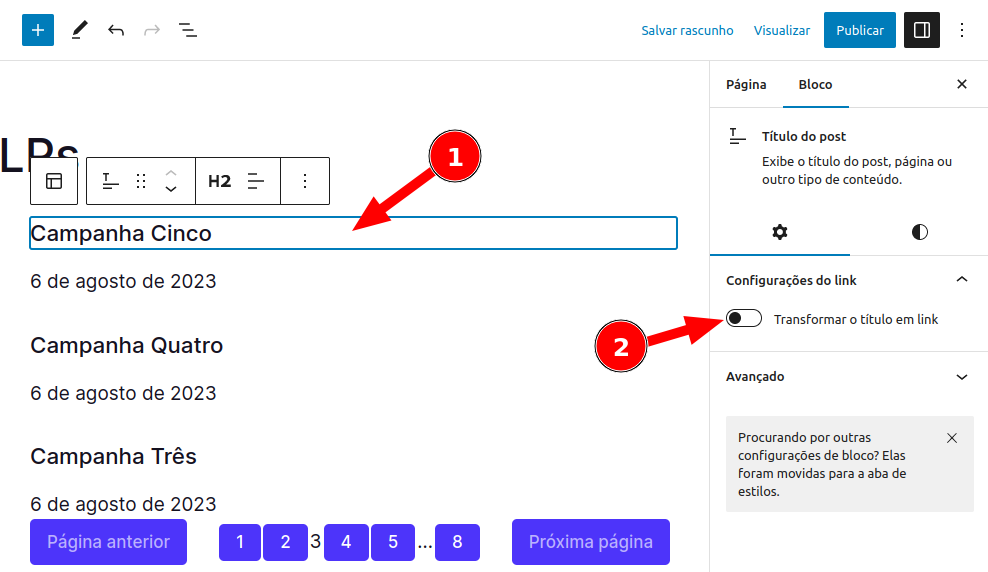 7. Clique em algum dos títulos no conteúdo e nas configurações do bloco ative a opção: Transformar o título em link